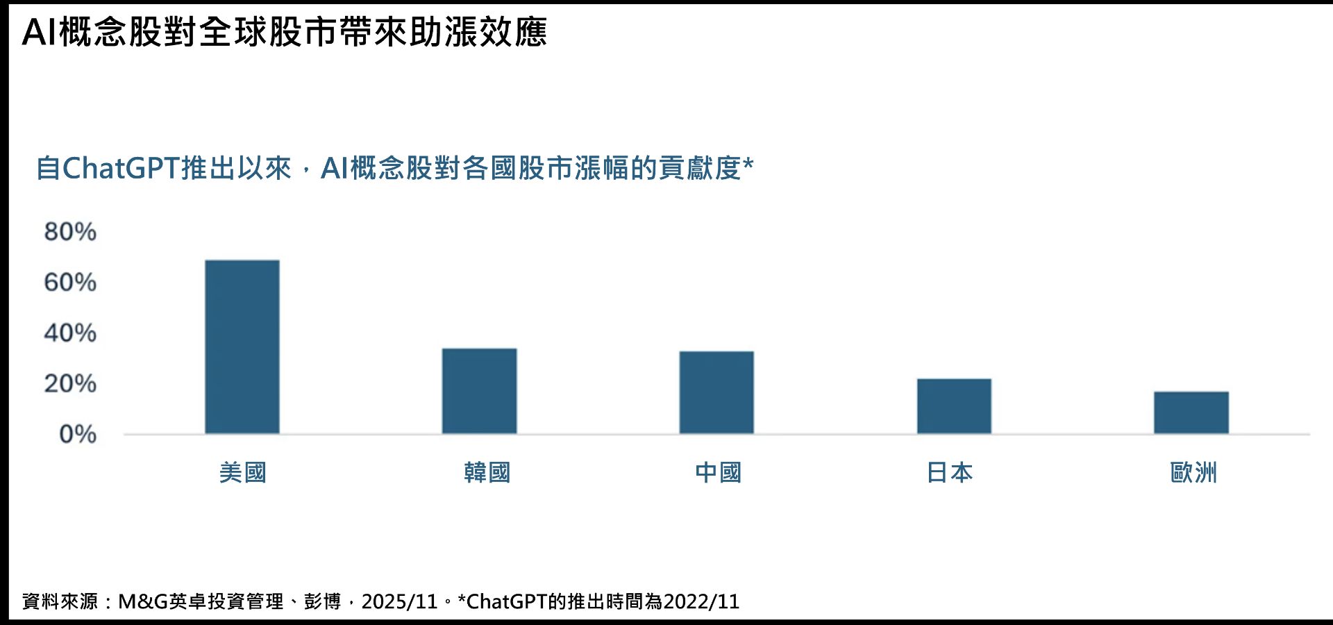 國際市場呈現了類似的模式,只是集中程度較低:例如日本東證100 指數約有 25% 的漲幅、韓國 Kospi 100 指數約有 35% 的漲幅、歐洲 STOXX 100 指數約 20% 的漲幅、中國滬深 300 指數約三分之一的漲幅,盡皆歸功於 AI 概念股3。相關股市的漲幅集中程度,完全體現在算力價值鏈上,其中輝達、台積電與 SK 海力士想當然爾是領漲主力。